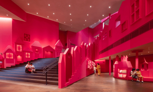 ピンク色の外観とカラフルな館内は、まるで絵本の中に入り込んだような空間。